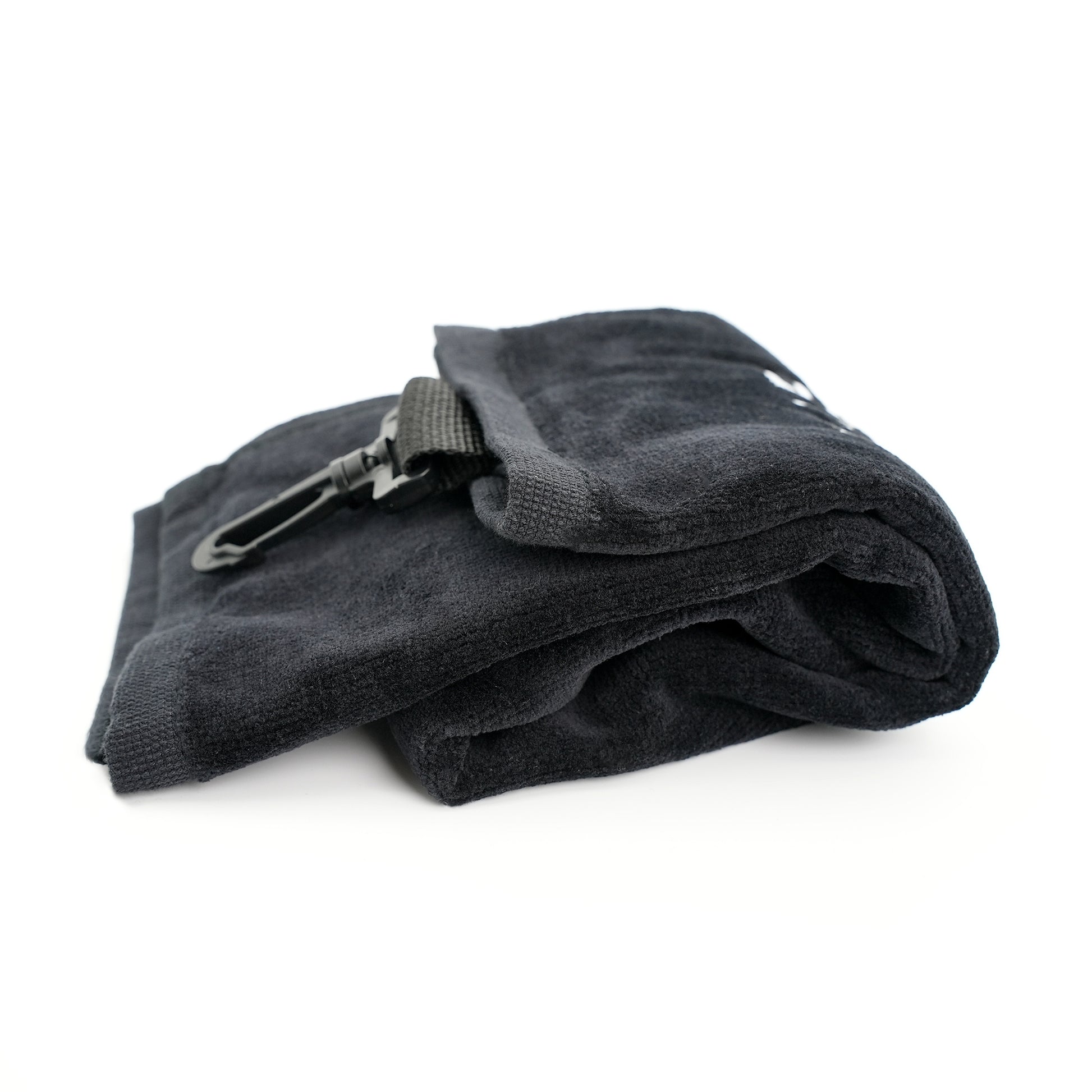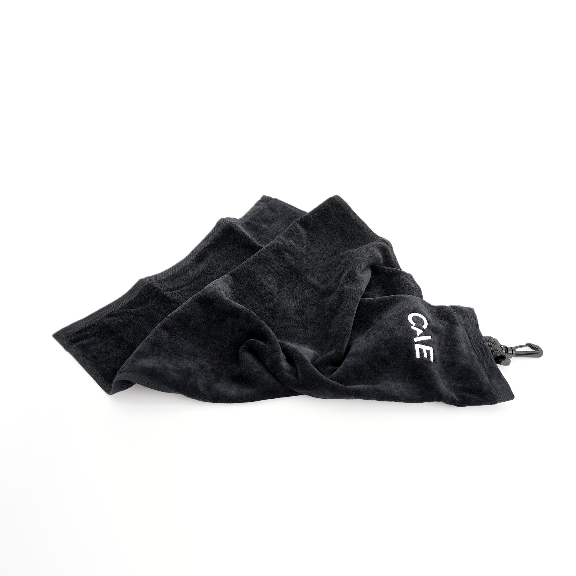 Stay prepared on the course with this premium CAE golf towel. Made from soft, absorbent black fabric, it’s designed to keep your equipment clean and dry. The towel features the CAE logo embroidered in white for a professional look and includes a sturdy clip for easy attachment to your golf bag.