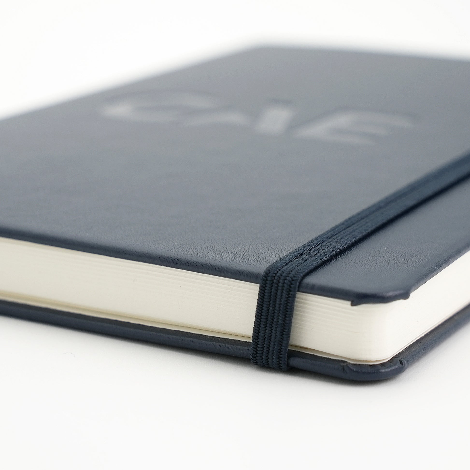An elegant navy hardcover notebook with the CAE logo embossed on the cover for a refined look. It features lined pages for clear note-taking, an elastic strap for secure closure, and a ribbon bookmark to keep your place. Built for both professionalism and practicality, it’s perfect for meetings, training, or daily journaling.
