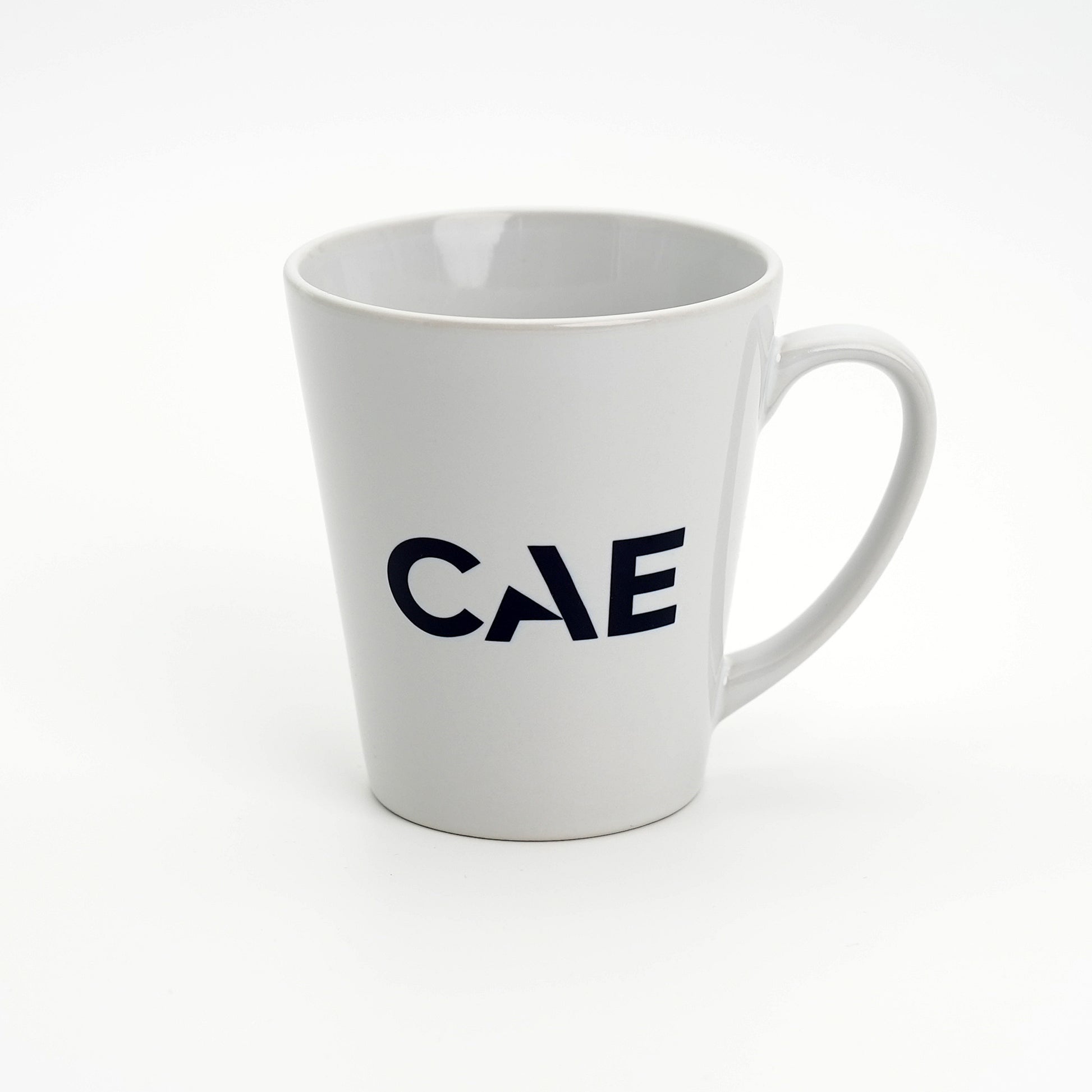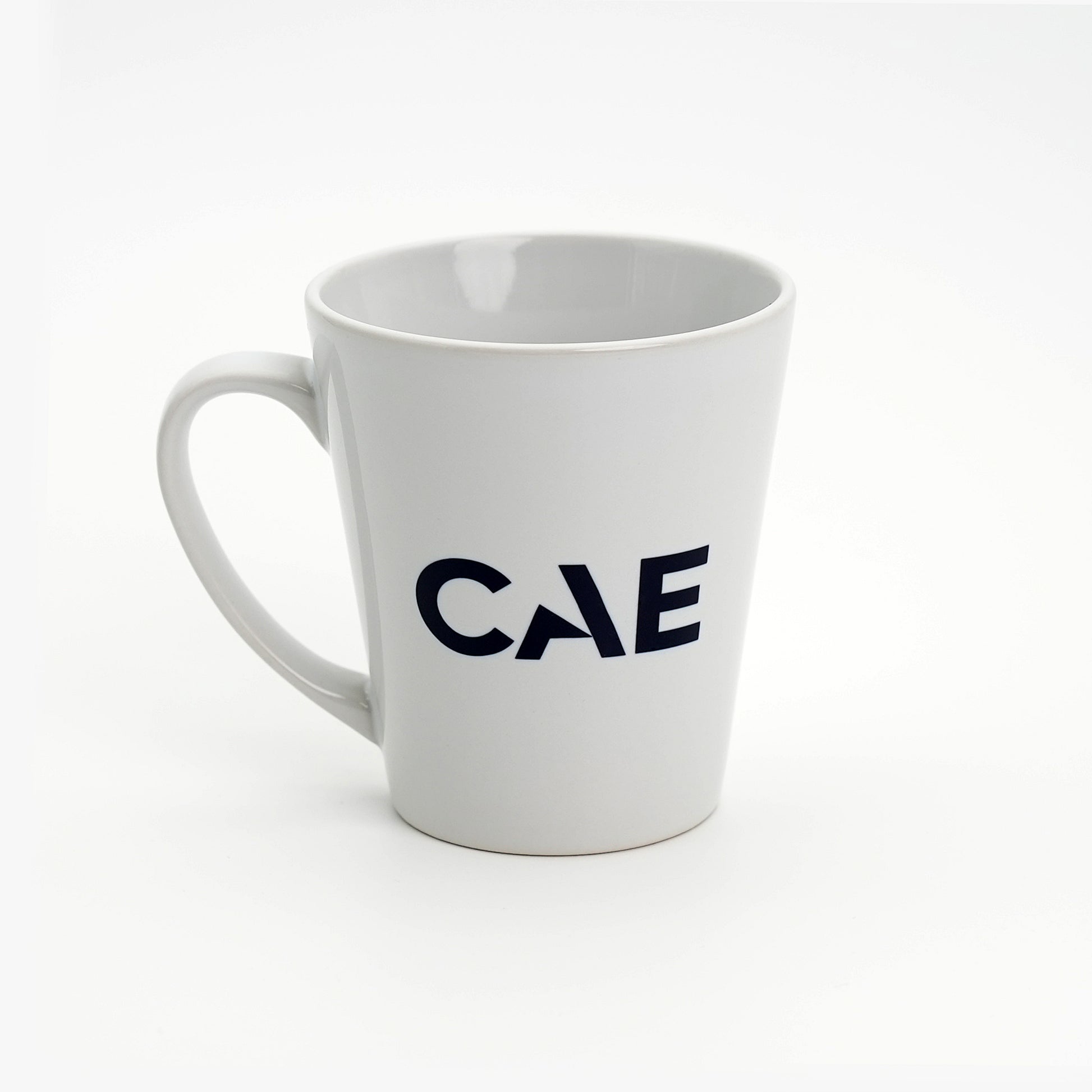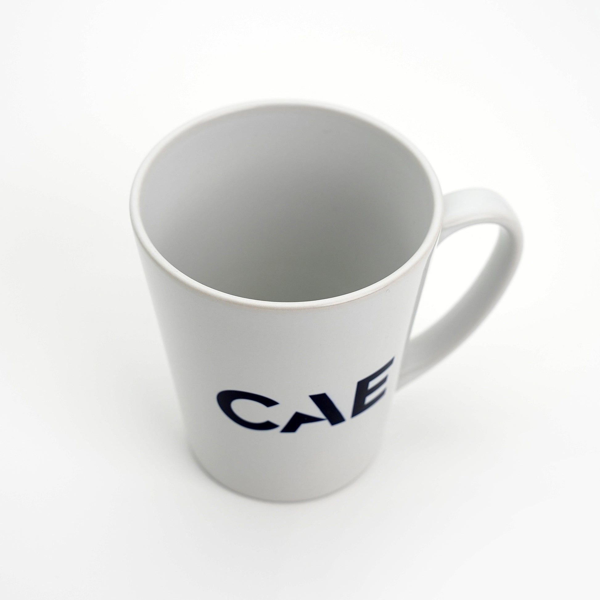 A timeless white ceramic mug featuring the bold CAE logo. Its tapered design and comfortable handle make it ideal for your morning coffee or tea at work and at home. Sturdy, practical, and a subtle way to show your CAE pride. Microwave and dishwasher safe.